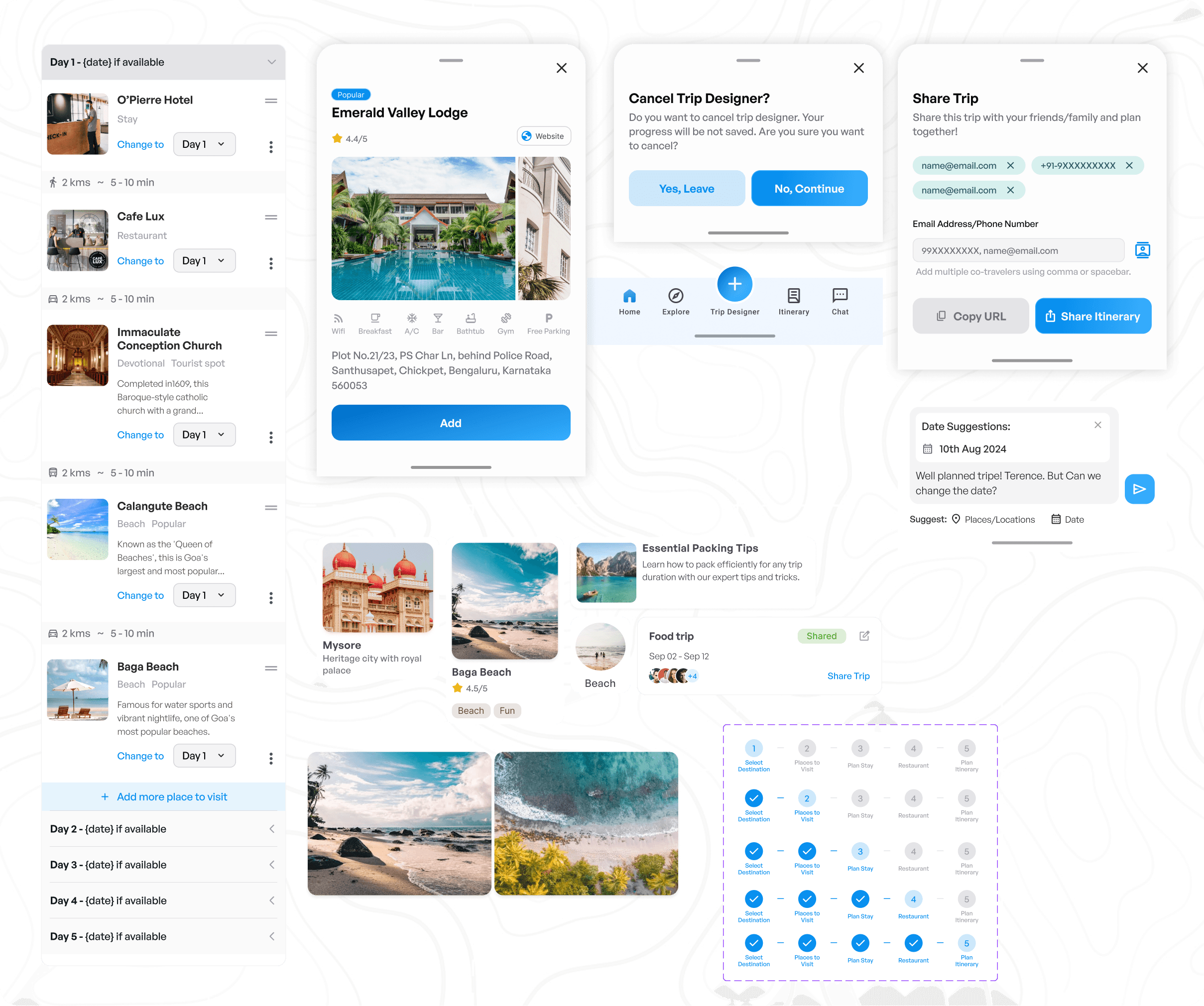 Accessible from Home, My Itinerary, or Explore. Users pick a destination, set dates (or trip duration), and optionally view a map preview