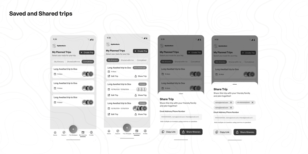Trips are divided into My Itinerary (created trips), Shared with Me (trips from collaborators), and Completed (auto-updated post-trip).