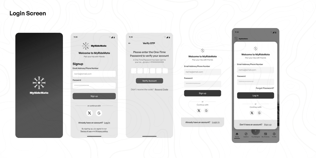 MyRideMate guides users from onboarding to intuitive trip creation, collaborative sharing, and real-time group chat—ensuring seamless navigation and effective communication throughout the planning process.